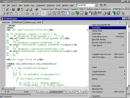 Um recurso importante para o desenvolvimento com Werbsnap é que agora você pode escolher um editor de HTML, como por exemplo o Macromedia Dreamweaver ou o Allaire Homesite. Podemos fazer o mesmo para arquivos XML, usando o XMLSpy, ou um editor de XSLT para definir apresentação e transformação XML. Para configurar essas opções, o Delphi possui uma opção popup chamada "HTML Editor" (Figura 1).