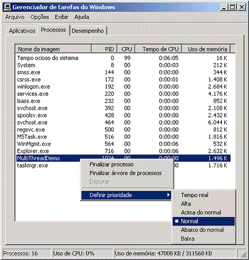 4) Abra o gerenciador de tarefas (task manager) do Windows NT pressionando Ctrl+Shift+Esc (Ctrl+Alt+Del no Windows 95). No NT você pode verificar que sua aplicação é um processo, faz uso de memória e CPU, além de possuir uma prioridade que pode ser setada em tempo de execução pelo próprio Windows (clique com o botão direito sobre o processo). Veja a Figura 1. No windows 9x/ME é possível apenas visualizar o nome do processo.