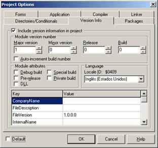 Porém, podemos fazer diferente. O Delphi possui – a partir da versão 3 – um interessante recurso com informações sobre a versão atual. É bem simples ativá-lo e configurá-lo. Com o seu projeto aberto pressione CTRL-SHIFT-F11. Aparecerá a janela “Project Options”. Clique na guia “Version Info” (Figura 1) e marque a opção “Include version information in project”.