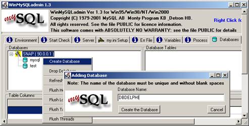 Vamos agora criar um banco de dados simples usando o WinMySQLadmin. Para isso, clique sobre a guia "Databases", depois com o botão direito na área sobre a árvore de databases à esquerda do painel, e escolha "Create Database", (Figura 1). Dê o nome de "DBDELPHI" ao novo banco de dados, e clique sobre "Create the Database". Uma mensagem de sucesso deve aparecer. Clique depois em "Cancel", pois não queremos criar mais bancos.