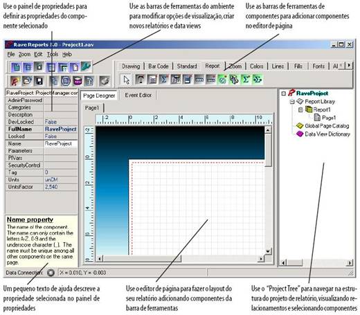 Os relatórios Rave de uma aplicação são gerenciados em um projeto de relatório, armazenado em um arquivo com a extensão .RAV. O Rave Visual Designer é o ambiente de desenvolvimento integrado de projetos Rave. Para iniciar, escolha a opção Tools|Rave Designer do menu ou faça um duplo-clique em um componente TRvProject adicionado a um formulário. Conheça os elementos do Rave Visual Designer acompanhando a Figura 1.