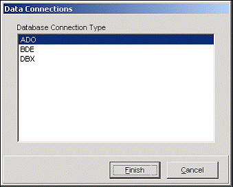 Para criar uma conexão no Rave Visual Designer, selecione a opção New Data Object do menu File e a caixa de diálogo Data Connections será exibida (Figura 2). Selecione Database Connection e clique em Next. Em seguida selecione o driver de conexão desejada: ADO, BDE ou DBX (dbExpress). Conforme o método de conexão escolhido, será mostrada uma caixa de diálogo apropriada solicitando os parâmetros para a conexão.
