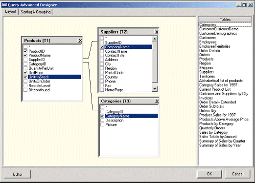 Um editor visual de consultas mostrando todas as tabelas do banco de dados é exibido (Figura 4). Neste editor você arrasta com o mouse o nome das tabelas para a área de Layout e estabelece ligações (joins) entre elas, também arrastando com o mouse o nome de uma coluna para o nome da coluna correspondente na outra tabela. Você pode também marcar os checkboxes das colunas que deseja obter e definir a ordenação dos resultados clicando na aba Sorting & Grouping.