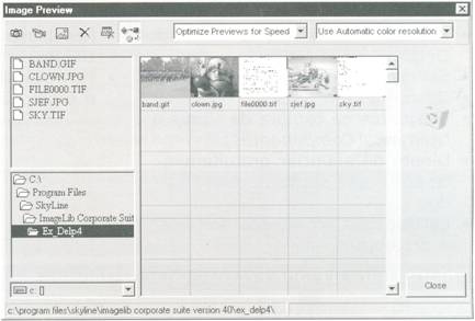 O componente TThumbnail implementa em nosso projeto um Form com um Grid onde são exibidos um ‘preview’ dos arquivos de imagens de um determinado diretório. Veja na figura1 um exemplo que vem junto com o componente em execução, utilizando os recursos do componente Tthumbnail: