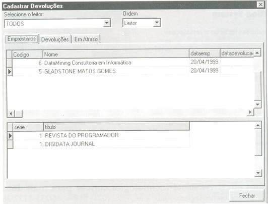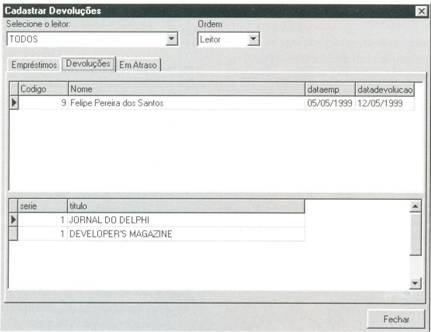 O que deve ser feito agora é o cadastramento das devoluções. O usuário fará o registro de devolução de uma forma bem simples: dando um clique duplo sobre o empréstimo referente. No evento ondblClick do objeto DbGrid, o sistema exibirá uma caixa de diálogo pedindo a confirmação da entrega. Caso a resposta seja positiva, será gravado a data de devolução do empréstimo na tabela.