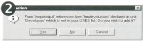Salve o projeto e execute. O Delphi irá questionar a inclusão da chamada a esta unidade2. Basta responder Yes e prosseguir.