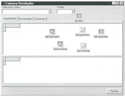 Ok! A primeira Aba já está funcional. Devemos agora criar a funcionalidade da Segunda aba, cujo objetivo é exibir todos os empréstimos que já foram devolvidos. Primeiramente, a aba deve ser preenchida com os dois objetos TdbGrid correspondentes, conforme mostra a figura 3.