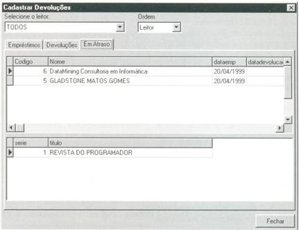 Para exibir os empréstimos em atraso, basta incluir a cláusula abaixo no evento OnChange do objeto cboLeitor: