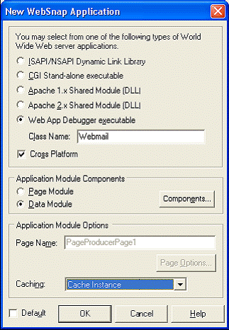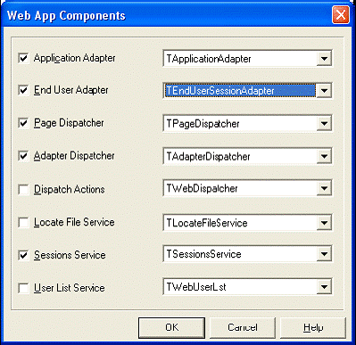 Crie uma aplicação WebSnap (usando File|New>Other>WebSnap> WebSnap Application) – veja a Figura 2. Será mostrada a caixa de diálogo da Figura 3. Escolha a opção Web App Debugger Executable. No campo Class Name digite “Webmail” e marque a opção Cross Platform para que a aplicação utilize a CLX. Na seção Application Module Components escolha Data Module e em Application Module Options altere a opção Caching para Cache Instance. Clique no botão Components para definir quais componentes de serviço do WebSnap serão utilizados. Marque a opção End User Adapter e na caixa de seleção escolha TEndUserSessionAdapter. Marque também o campo Sessions Service (veja a Figura 4) – isso adicionará recursos de controle de sessões à aplicação. Clique em OK duas vezes seguidas para criar a aplicação WebSnap.