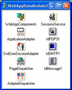 Adicione um componente IdPOP3 da paleta Indy Clients. Altere sua propriedade Host para o endereço do servidor POP3 que você vai utilizar, por exemplo pop3.seuprovedor.com.br. Insira um componente IdSMTP (paleta Indy Clients) e altere sua propriedade Host para o endereço do seu servidor SMTP. Adicione também um componente IdMessage da paleta Indy Misc. O WebAppDataModule deve estar semelhante ao da Figura 5.