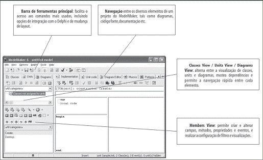O ModelMaker pode ser iniciado de forma independente, como vimos, ou através do Delphi (comando ModelMaker|Run ModelMaker). A Figura 2 apresenta as partes principais da tela do MM.