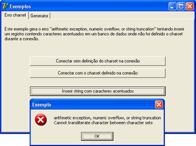 No exemplo que acompanha este artigo mostro como gerar esse erro, provocando-o através da inserção de um string com caracteres acentuados em um banco onde não foi definido o charset da conexão. A Figura 1 mostra a tela com a mensagem de erro gerada.