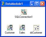 Crie uma aplicação no Delphi e adicione a ela um Data Module. No Data Module coloque um SQLConnection e dois SQLDataSets (ambos da paleta dbExpress), além de um DataSource (Data Access). Seu Data Module deve estar semelhante ao da Figura 1 (observe os nomes dados aos componentes).