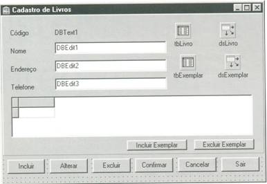 Abra o formulário de Livros, e insira 2 (dois) objetos TTable. Estes objetos servirão para verificar se o livro ou exemplar atual já participaram de algum empréstimo. Configure suas propriedades de acordo com as tabelas 2 (dois) e 3 (três):