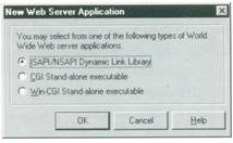 ISAPI/NSAPI A aplicação será gerada em forma de DLL. Esta opção irá oferecer melhor desempenho e menos consumo de memória, pois a aplicação será alocada somente uma vez na memória. Os demais usuários irão utilizar a mesma instância do aplicativo, já instanciada no mesmo espaço de memória do servidor Web. A opção NSAPI representa a mesma tecnologia para servidores NETSCAPE.