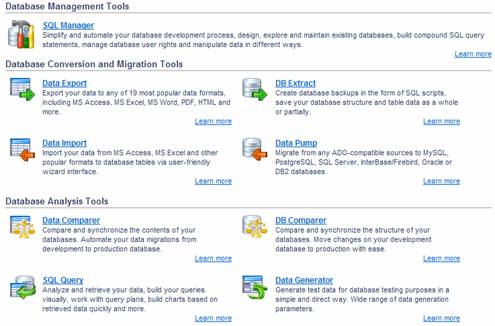 Cada Studio como é apresentado, possui ferramentas auxiliares que podem ser baixadas ou adquiridas separadamente, como por exemplo, uma ferramenta apenas para importar/exportar dados, para extrair estrutura e dados do banco, migrar de um banco para outro (pump) entre outros (Figura 2).
