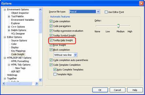Primeiro teremos que habilitar nosso IDE pra exibir o painel de ajuda em tempo de desenvolvimento, para isso, acesse o menu Tools>Options>Editor Options>Code Insight. No ComboBox Source file type selecione a opção Pascal e logo em seguida marque a opção Tooltip Help Insight caso não esteja e clique em Ok (Figura 1).