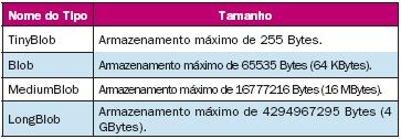 No MySQL existem quatro tipos de campos BLOB que diferem apenas pelos valores máximo de informação que podem armazenar, como mostrado na Tabela 1.