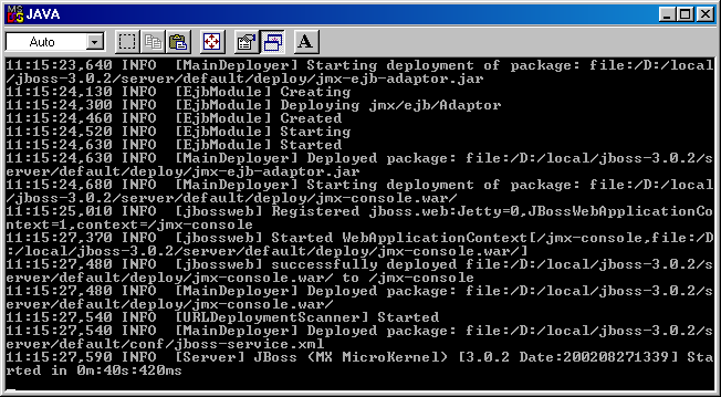 Antes de iniciar o servidor, certifique-se de que seu ambiente inclui a definição correta para a variável de ambiente JAVA_HOME. Podemos utilizar o Java 2 SDK (JSDK) versão 1.3 ou 1.4. Note que é necessário o JSDK completo; não é suficiente utilizar o JRE, pois o JBoss (como outros containers de servlets e de EJBs) necessita de acesso ao compilador Java. Portanto, certifique-se também de que o pacote tools.jar esteja presente no classpath. Tome cuidado, pois, caso seu classpath inclua algum outro pacote que implemente as APIs do J2EE (como o J2EE SDK da Sun), pode haver problemas na execução do JBoss.