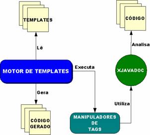 A execução de um template do XDoclet segue este fluxo: o engine carrega um template, identifica os tag handlers utilizados nele e executa os tag handlers à medida que prossegue analisando o template. Os handlers fazem uso do xjavadoc para obter as informações necessárias (as @tags) e geram o resultado final. Veja a Figura 1.