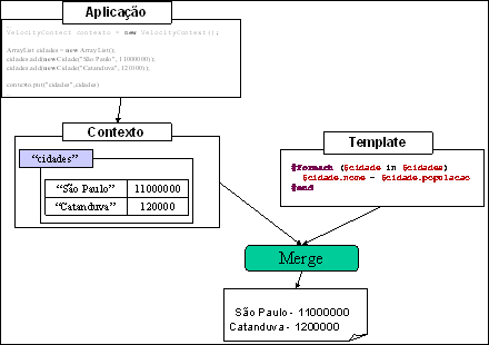 Uma vez criado e preenchido o contexto, prossegue-se para o merge. Durante o merge ("mistura" ou "intercalação"), o Velocity interpreta as diretivas e extrai os dados necessários do contexto, gerando a saída desejada.