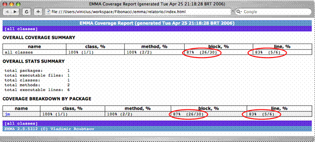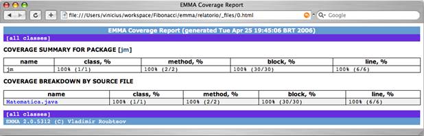 O código da classe que contém o método fibonacci() encontra-se na Listagem 1 e a classe de teste correspondente está na Listagem 2. Depois veremos como gerar o relatório do Emma indicando a cobertura de teste da classe, mas por enquanto você já pode ver o resultado da análise do Emma na Figura 1.