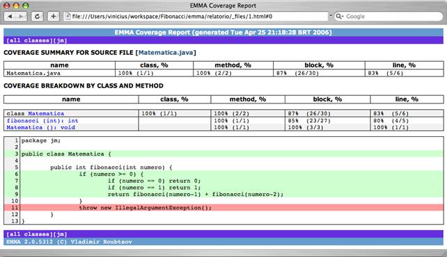 No topo, vemos um resumo da cobertura do arquivo Matematica.java como um todo. Logo abaixo, o Emma apresenta a cobertura por classes contidas no arquivo. Para cada classe são apresentados os percentuais de cobertura agrupados por métodos. Por fim, o Emma mostra o código fonte do arquivo e colore com verde todas as linhas que são plenamente exercitadas quando os testes são executados. Quando uma linha não é executada, o Emma a realça em vermelho; já quando a linha foi parcialmente executada a cor amarela é usada. A idéia de uma linha parcialmente executada é explorada com mais detalhes adiante.
