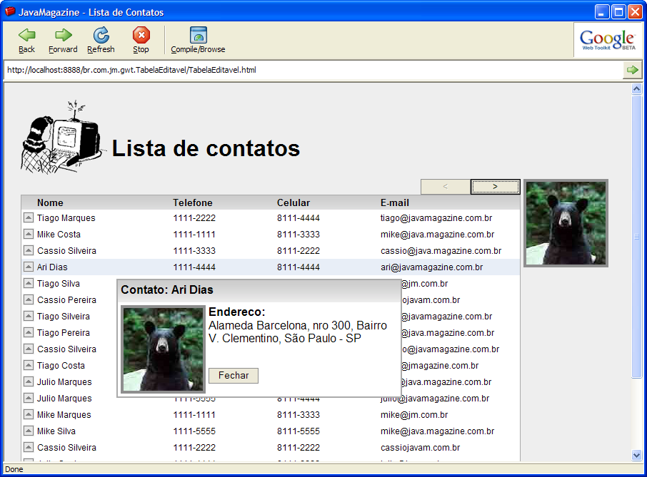 O exemplo que construiremos será uma lista de contatos (veja a Figura 1), formada por uma tabela com paginação e uma área de exibição de fotos. Além disso, criaremos uma caixa de diálogo que mostra mais informações sobre um contato selecionado na tabela. Veja algumas particularidades do exemplo: