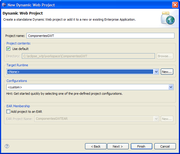 Começamos criando um projeto GWT. No Eclipse (com o WTP e o Googlipse instalados), acione File|New>Project>Web>Dynamic Web Project. Na primeira tela (Figura 2) preencha apenas o nome do projeto (“ComponentesGWT”) e clique