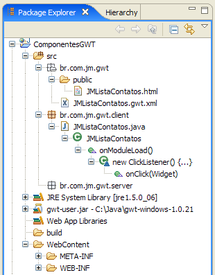 · br.com.jm.gwt.public.JMListaContatos.html – Arquivo HTML com tags indicando as posições onde serão incluídos os componentes AJAX, e onde é importada a biblioteca JavaScript do GWT (gwt.js). Esse arquivo, que é chamado na documentação do GWT de Host Page, possui também um elemento