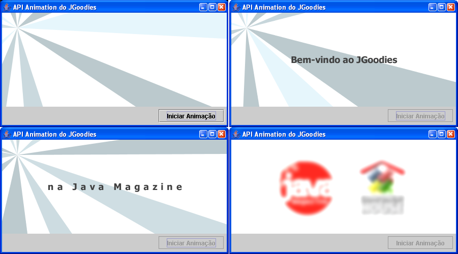 O exemplo é basicamente uma seqüência de frases que são apresentadas gradativamente na tela. Ao fundo, temos uma animação que lembra raios rodando no sentido horário, a qual o JGoodies chama de “animação do ventilador” (fan animation, em inglês). Os textos são apresentados na seguinte ordem: