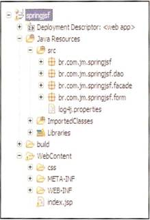 Com o Eclipse funcionando, basta importar o arquivo springjsf.war também incluído no ZIP, através de File\Import>Web>WAR. Utilizamos “springjsf” como contexto da aplicação. A estrutura do projeto deverá ser similar à da Figura 2.