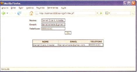 Como vimos no início, a classe de domínio do exemplo é Contato (Listagem 2). Essa classe é utilizada tanto para enviar quanto para trazer as informações de um contato do banco de dados. O exemplo inclui também a página index.jsp, que utiliza JSF (Listagem 3). Quando o exemplo estiver sendo executado, essa página se torna acessível através da URL http://localhost:8080/springjsf/index.jsf. A Figura 3 apresenta o exemplo em execução.