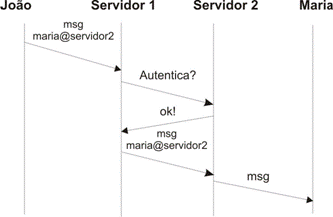 O XMPP também realiza comunicação entre dois usuários registrados em servidores diferentes. Por exemplo, o usuario joao@servidor1.com irá se comunicar com o usuário maria@servidor2.com, sendo cada um cadastrado nos servidores XMPP servidor1.com e servidor2.com. O diagrama da Figura 1 ilustra a comunicação entre os dois usuários.