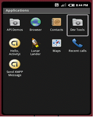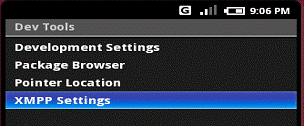 Na atual implementação do Android, um usuário é mapeado em cada seção (conexão). Para isto, acessamos o menu gráfico Applications>Dev Tools (Figura 2)>XMPP Settings (Figura 3).