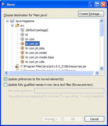 As classes do exemplo não estão agrupadas por pacotes, e o Eclipse ajuda a resolver esse problema: basta criar sua estrutura de pacotes (isso precisa ser feito manualmente) e arrastar as classes para dentro deles. Outra alternativa para mover uma classe é clicar sobre ela e em seguida acessar o menu Refactor>Move... Uma tela se abrirá com os possíveis locais para onde ela pode ser movida, como mostra a Figura 3.