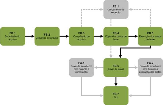 | FB.5 | O sistema executa os casos de teste. Caso ocorra algum erro durante a execução dos testes, o fluxo é desviado paraFE.1. |