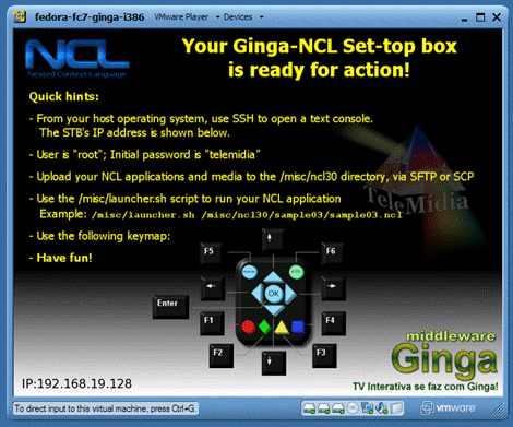 A Figura 1 mostra a tela inicial apresentada após o boot do set-top box virtual. Esta tela mostra como carregar aplicações no set-top box virtual e como executá-las. Também é mostrado o IP da máquina virtual, que na figura aparece como 192.168.19.128, mas pode mudar na sua instalação, e a correspondência entre os botões que seriam do controle remoto e o teclado padrão do computador.