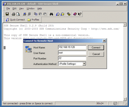 Ao executar o SSH Secure Shell Client, selecione no menu File a opção Quick connect. No campo Host Name insira o endereço IP da máquina virtual, e no campo User Name, o usuário "root", conforme mostra a Figura 2. Ao clicar em Connect, é requisitada a senha de usuário, que é "telemidia".