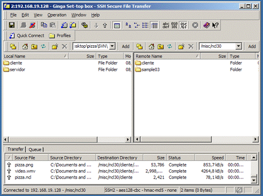 Ainda no SSH Secure Shell, selecione o menu Window>New File Transfer. É aberta uma nova janela na qual são mostrados os diretórios locais à esquerda e os diretórios internos à máquina virtual, à direita. Através dos ícones de navegação ou digitando diretamente, acesse o diretório /misc/ncl30 da máquina virtual. Selecione do lado esquerdo o diretório em que se encontra a aplicação cliente e arraste-o para a máquina virtual, obtendo o resultado da Figura 3.