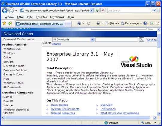 Para iniciar o desenvolvimento da aplicação, é necessário ter em seu computador o DAAB, caso você não possua, o download pode ser realizado no seguinte endereço: msdn2.microsoft.com/en-us/library/aa480453.aspx, onde podemos fazer o download de todos os blocos da Enterprise Library (Figura 1).