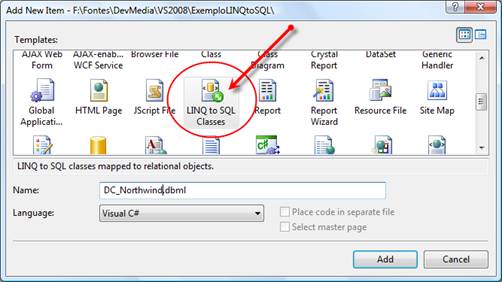 Figura 1. Utilizando o Template LINQ to SQL Classes