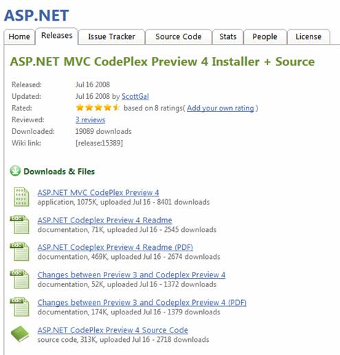 Se você ainda não tem o ASP.Net MVC instalado, pode baixá-lo do Codeplex, o site de projetos Open Source que a Microsoft disponibiliza, que é onde estão sendo depositados os códigos dos Previews, assim como updates mais freqüentes (que acontecem entre os CTPs), para quem tiver interesse de acompanhar o desenvolvimento mais de perto. O endereço do projeto é www.codeplex.com/aspnet, e você pode baixar o instalador e o código fonte clicando na aba Releases. Veja na Figura 1 os downloads disponíveis.