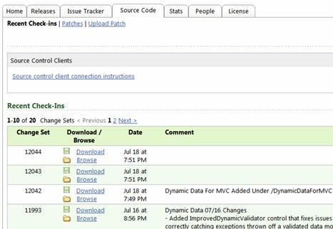 Como já foi dito, você pode baixar o código fonte, disponível na última opção, ou o instalador, disponível na primeira. Para este artigo utilizarei a primeira opção, que tem um instalador que já integra o ASP.Net MVC P4 com o Visual Studio 2008. Se você quiser acompanhar mais de perto o desenvolvimento do ASP.Net MVC também pode clicar na aba Source Code e baixar as versões que estão em desenvolvimento, geralmente com atualizações semanais (não garantidas), como pode-se ver na Figura 2. O fonte também está disponível para visualização online, clicando-se no link Browse.