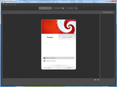 Para auxiliar na criação de composições vamos utilizar o Deep Zoom Composer. Para baixá-lo, consulte no Google por download deep zoom composer. Vários links irão surgir. Este é um software free, bem pequeno, menos de 4Mb. Após sua instalação, abra o programa. Uma tela similar à Figura 4 será exibida.