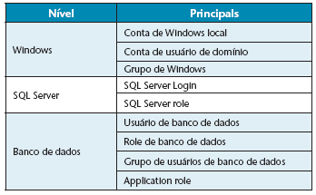 • Principals: é qualquer entidade autenticada que pode possuir permissões para acessar um objeto no sistema de banco de dados. Principals podem existir em três níveis: Windows, SQL Server e banco de dados. A Tabela 1 apresenta os principals do SQL Server 2005.
