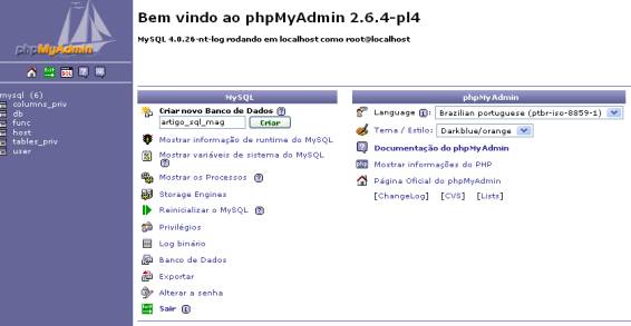 Para criarmos e gerenciarmos o banco de dados MySQL, utilizaremos a ferramenta gráfica phpMyAdmin. Criaremos um banco de dados com uma tabela, como proposto no item anterior. Para tanto, utilizaremos o phpMyAdmin, mas esse processo também poderia ser feito de forma manual. Na tela inicial do phpMyAdmin, crie um banco de dados com o nome “artigo_sql_mag”, como mostrado na Figura 1.