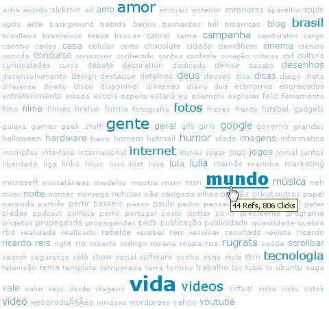 Neste tooltip pode-se indicar a quantidade de conteúdos que a tag classifica, tornando mais fácil a visualização da quantidade de ocorrências da mesma. A Figura 1 apresenta uma tag cloud, retirada de um blog nacional. Pode-se notar que, quando o ponteiro do mouse repousa sobre uma tag, as informações sobre a freqüência são apresentadas como um tooltip, junto com a quantidade de cliques que foram feitos nesta tag.