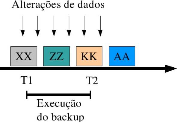 Percebe-se a partir da análise da Figura 1 que o procedimento de cópia não é discreto, ou seja, ele se estende por um período de tempo. Assim, a rotina de cópia de dados deve garantir uma imagem da base de dados que reflita a sua situação no momento em que o backup se iniciou (T1) ou que contenha a posição dos dados ao término do procedimento (T2). Neste ponto, surge uma questão fundamental que é determinar se a base de dados copiada estará ou não acessível aos seus usuários no momento em que a cópia de segurança está sendo executada. Sob esta ótima é possível proceder de três formas distintas: