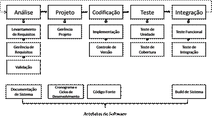 Todo o processo de desenvolvimento de software pode ser exemplificado como uma série de atividades a serem seguidas e cada uma destas atividades compreende outra série de sub-atividades, e assim sucessivamente. A Figura 1 busca exemplificar de forma macro um processo de desenvolvimento de software moderno e orientado a objetos. Inicialmente existe um processo de análise de software onde os engenheiros de software fazem o levantamento de requisitos da aplicação, fazem uso de técnicas de gerência de requisitos para organizar estes requisitos e, com o material, coletado é feita então a validação destas informações, com uma participação efetiva do usuário. O principal artefato de software gerado nesta etapa é a documentação de sistema. A próxima etapa é o Projeto, onde o gerente de projetos irá propor um cronograma e os ciclos de desenvolvimento de acordo com a documentação de sistema gerada na etapa anterior. Após isso, é feita a codificação, onde é realizada a implementação dos requisitos. Nesta etapa é de extrema importância a utilização de alguma ferramenta de controle de versão, como o CVS (Concurrent Version System) ou SVN (Subversion). O artefato de software gerado nesta etapa é o código fonte, que na próxima etapa é testado, utilizando diferentes técnicas de teste, como os de unidade, cobertura e funcional. Ainda há a atividade de integração, onde o artefato de software gerado nesta atividade é integrado em uma nova versão do sistema. Importante destacar que estas atividades ocorrem dentro de um ciclo de desenvolvimento incremental e evolutivo, onde estas atividades são continuamente repetidas para cada ciclo de desenvolvimento da aplicação. Desta forma, por exemplo, pode-se imaginar que a atividade de testes acontece ao longo de todo o processo de desenvolvimento de software, não apenas ao seu final.